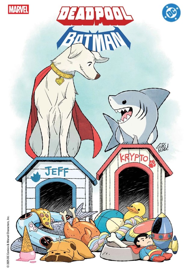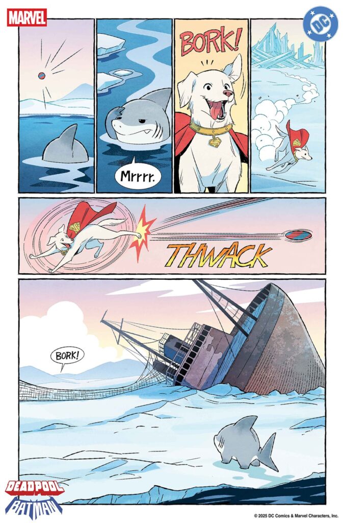 Mais ce crossover Marvel DC 2025 ne s’arrête pas là. On a aussi droit à une brochette de back-ups parce que “plus, c’est mieux”, même si c’est gratuit en cohérence. Vous prendrez bien un peu de Krypto et Jeff the Landshark signé Kelly Thompson et Gurihiru (oui, c’est mignon, on sait), un Daredevil vs Green Arrow par Kevin Smith (parce que pourquoi pas), et un Captain America x Wonder Woman par Chip Zdarsky et Terry Dodson qui arrive, promis, quelque part.