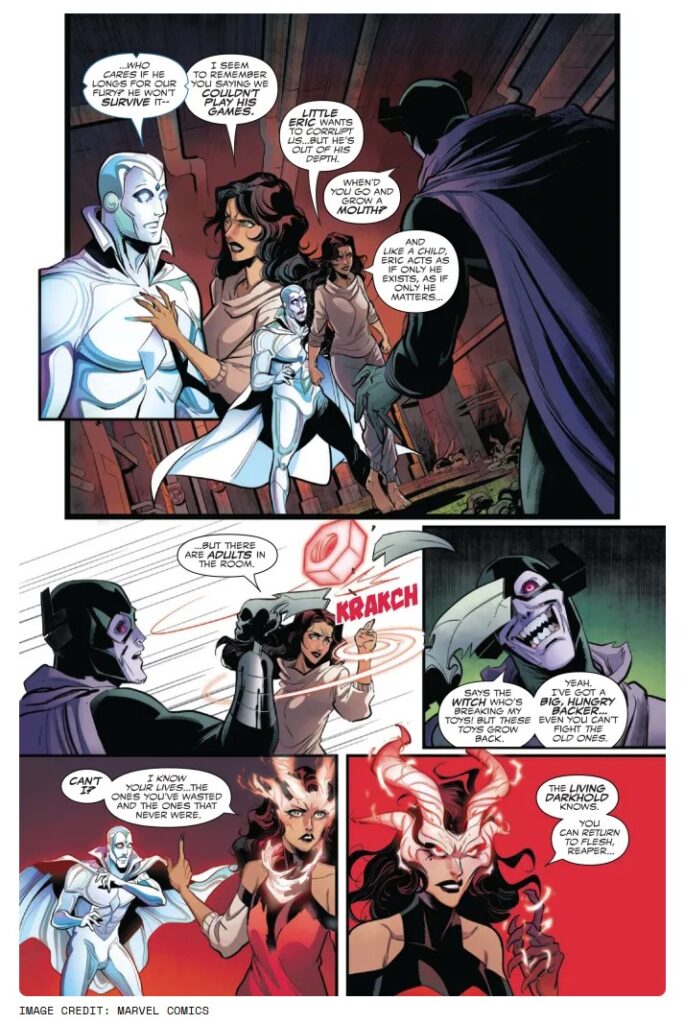 Dans l’univers papier, Wanda est actuellement l’hôte humain du Darkhold, mais jusqu’ici, elle réussissait à contenir ses pulsions maléfiques. Jusqu’à ce que le destin la mette, avec Vision, face à l’ennemi qui leur a causé le plus de douleurs : Grim Reaper. Et devinez quoi ? Le Darkhold commence à lui chuchoter à l’oreille…