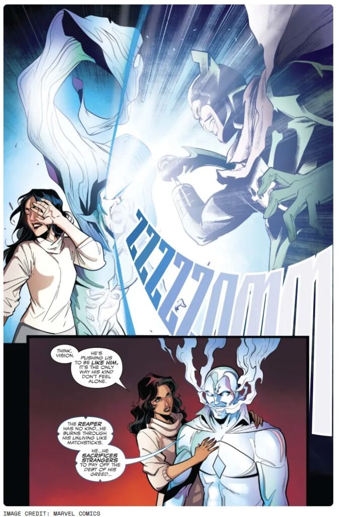 Dans l’épisode précédent, Vision retrouvait son fils défunt, Vin, et accomplissait quelques missions façon chasse au trésor dramatique. Mais à peine le temps de souffler que Grim Reaper revient pour régler ses comptes.