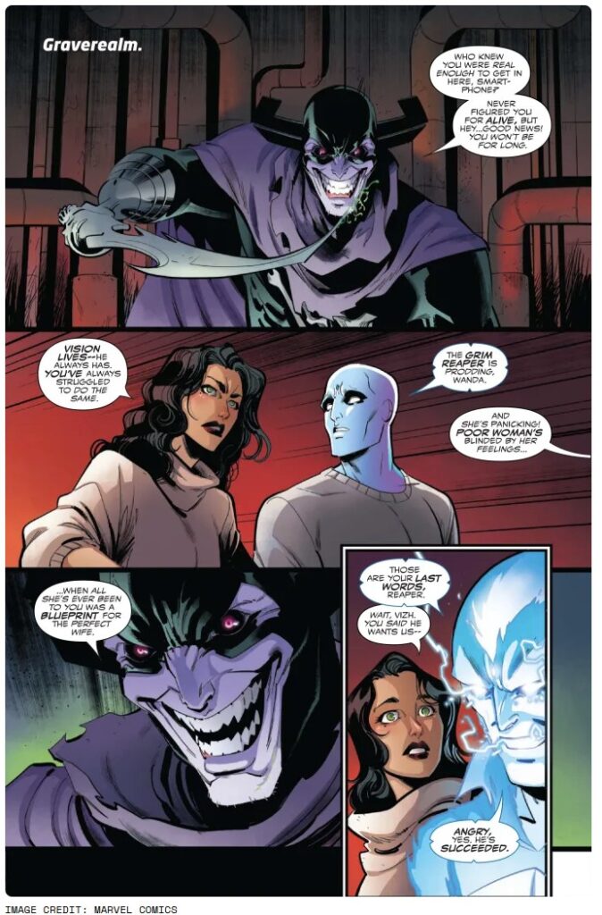“Derrière les Portes de la Mort ! Un affrontement ensorcelant dans Graverealm alors que Grim Reaper prépare son piège final pour Vision et Wanda !”