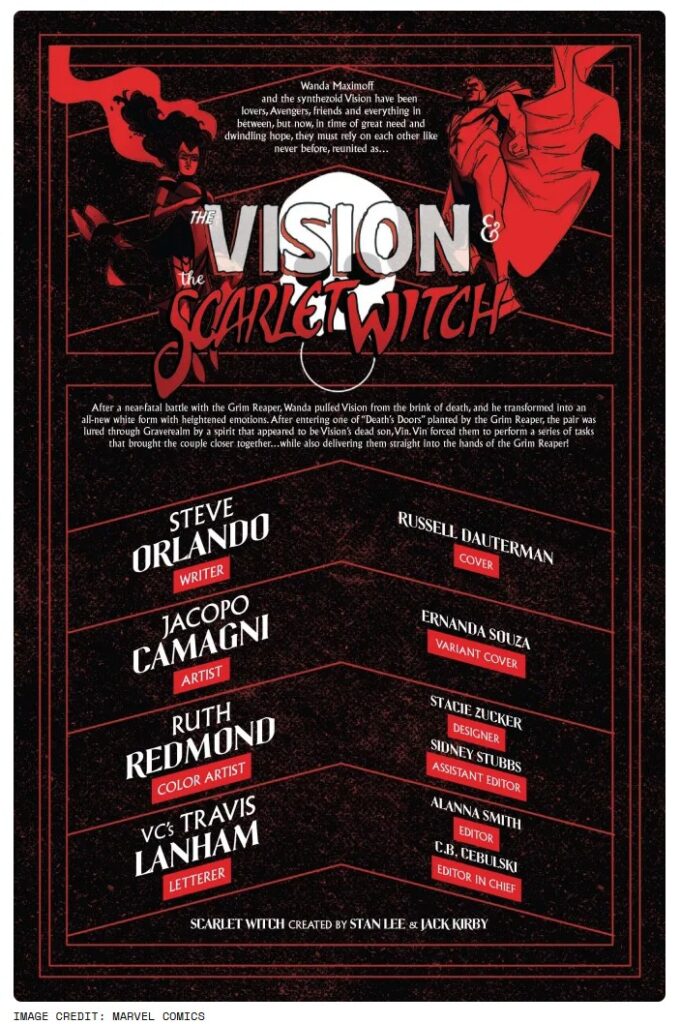 Dans The Vision & The Scarlet Witch #4 (Steve Orlando, Jacopo Camagni, Ruth Redmond et VC’s Travis Lanham), le duo se retrouve dans Graverealm, un royaume dirigé par Grim Reaper. Ce dernier a eu la brillante idée d’installer des “Portes de la Mort” un peu partout sur Terre, promettant aux vivants de revoir leurs proches disparus. Spoiler : dès qu’on passe la porte… on meurt.