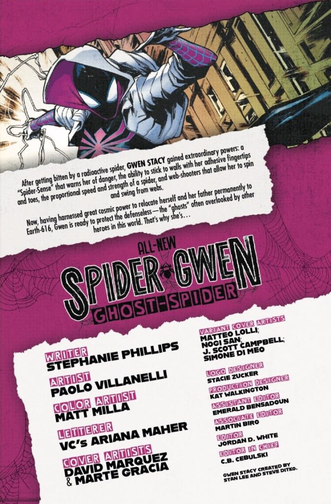 Vous pensiez en avoir fini avec les retours incessants des personnages Marvel ? Raté. Spider-Gwen – alias Ghost-Spider pour les intimes – revient dans une nouvelle série Marvel Comics, avec un premier numéro prévu pour mercredi prochain. Au scénario, Stephanie Phillips ; aux dessins, Paolo Villanelli ; et pour les couvertures principales, c’est David Marquez qui s’y colle. Bref, une équipe solide, mais ne vous emballez pas trop vite : Gwen Stacy a le chic pour transformer sa vie en sitcom dramatique.