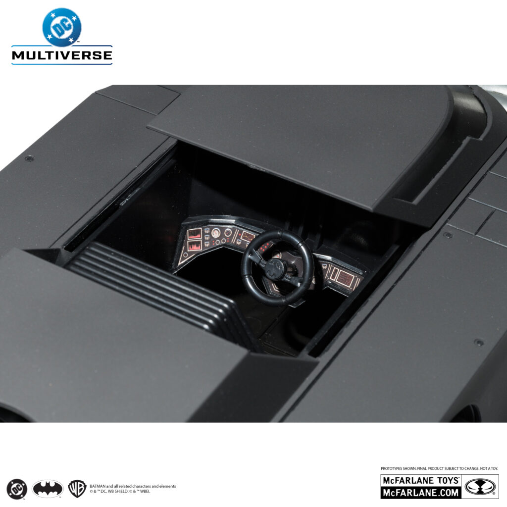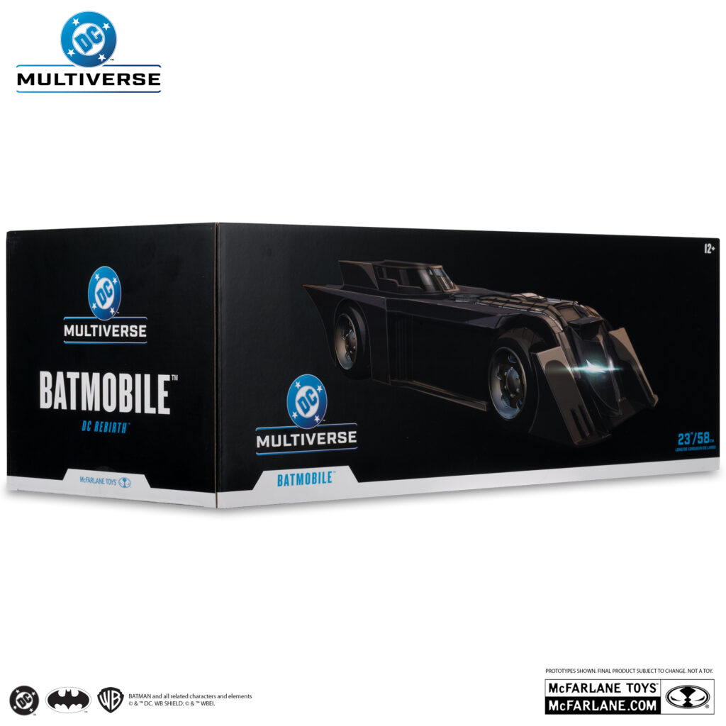 Basée sur le design des comics DC Rebirth, cette Batmobile est bien sûr détaillée à l’extrême (Todd adore le mot “incredibly detailed”). Compatible avec la plupart des figurines 7 pouces de la gamme DC Multiverse, elle a un cockpit qui s’ouvre en appuyant sur un bouton.
