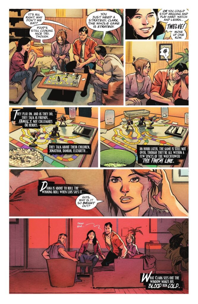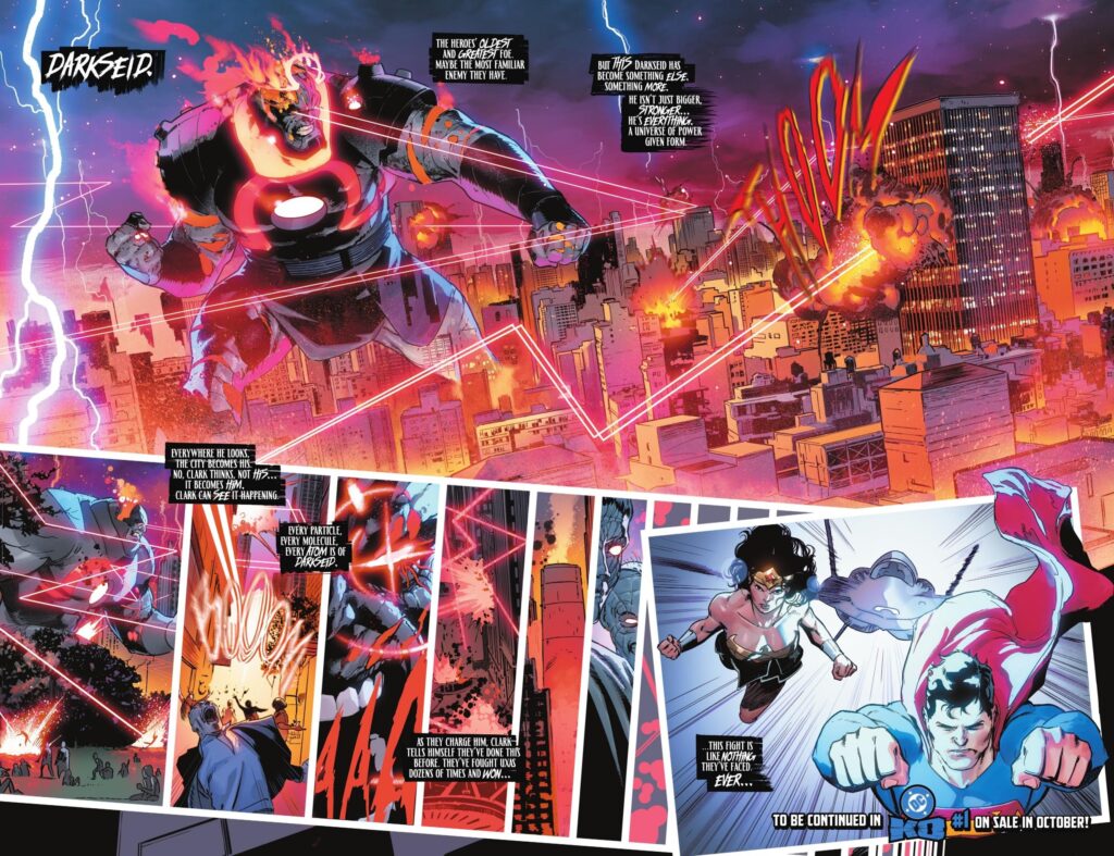 Dans une preview publiée cette semaine, on retrouve Superman peinard en soirée jeu de société (oui, même Kal-El doit s’occuper entre deux sauvetages) quand soudain : Darkseid débarque sur Terre. Panique générale, baston en vue. Dernière apparition du grand méchant ? DC All In Special #1 à l’automne dernier. Autant dire qu’il était temps de le ressortir du placard.