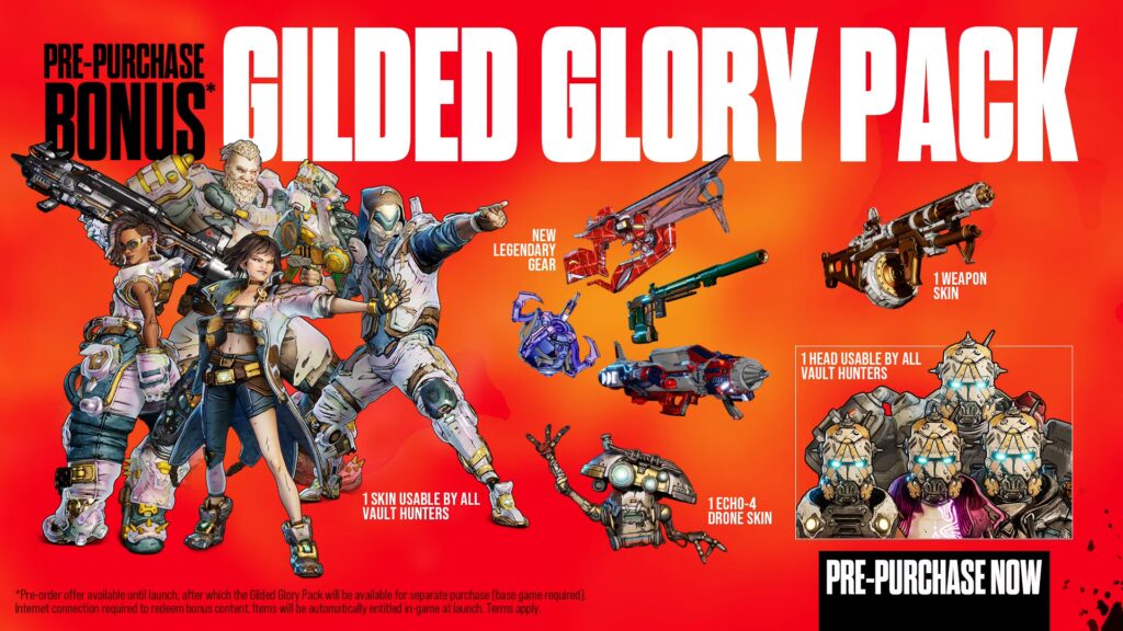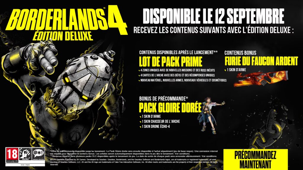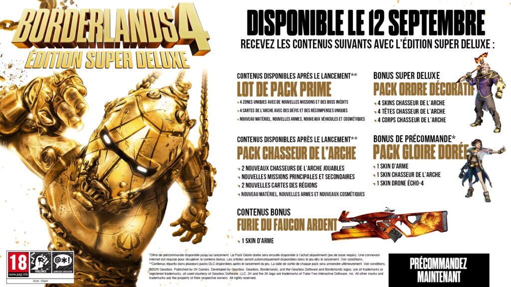 Si vous avez encore quelques euros coincés entre vos coussins de canapé, sachez que la précommande de Borderlands 4 vous file le Pack Gilded Glory. Et parce qu’il faut bien appâter les joueurs, 2K balance aussi quatre armes légendaires et un cosmétique de tête. Parce qu’un skin doré, ça fait toujours mieux passer la douloureuse.