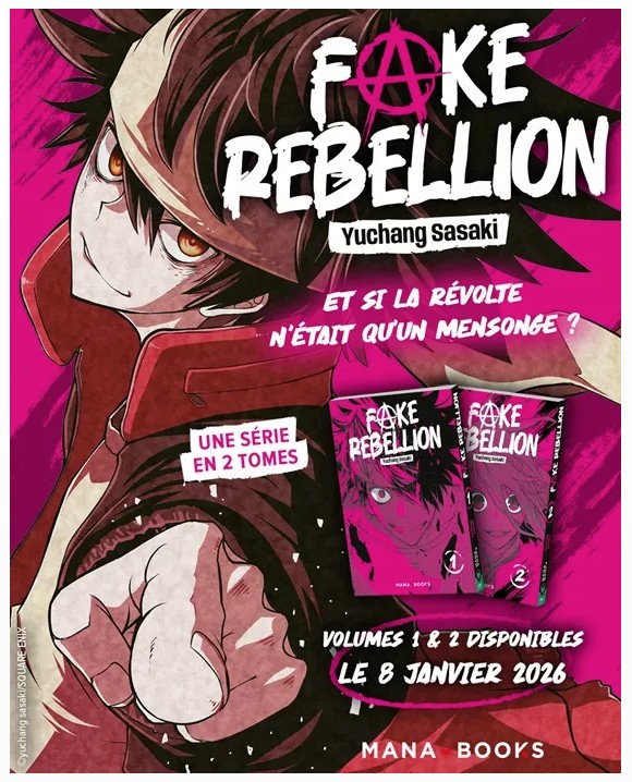 Accrochez-vous à vos porte-monnaie : Mana Books ouvre l’année 2026 avec sa première nouveauté manga, Fake Rebellion, une série courte, intense et surtout déjà terminée en 2 tomes (oui, pour une fois, pas besoin d’attendre 15 ans pour connaître la fin). Les deux volumes sortiront simultanément le 8 janvier 2026 au doux prix de 7,95€ pièce.