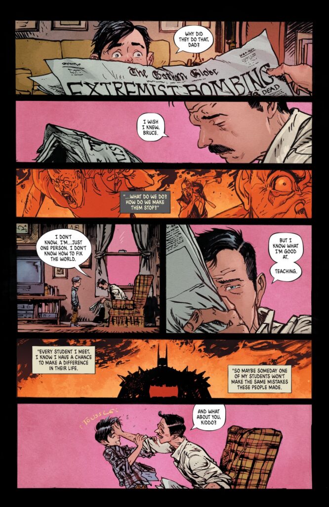 Dans les premières planches révélées, Bruce Wayne part faire le plein de gadgets en mode séjour rural. Pendant sa petite excursion, il découvre :