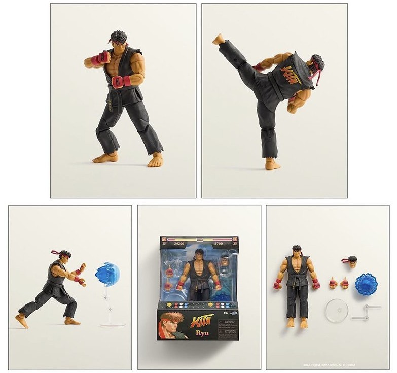 Chez Jada Toys, c’est le festival du clin d’œil marketing : on retrouve Ryu dans un gi KITH tout droit sorti de Ultra Street Fighter II, et même Mega Man affublé du fameux logo. Parce qu’évidemment, rien ne dit “combat à mort entre humains et robots” comme un branding bien placé sur la poitrine.
