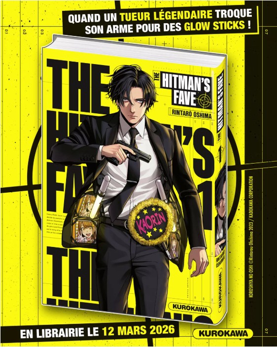 Parce que 2026 n’avait clairement pas demandé ça, Kurokawa a décidé d’annoncer l’arrivée française du manga The Hitman’s Fave (alias Koroshiya no Oshi) pour le 12 mars 2026, proposé au tarif raisonnable (ou pas) de 7,95 €. Une traduction signée Jasmine Bretcha, qui va devoir jongler entre jargon mafieux et cris de fans en concert. Courage à elle.