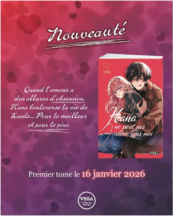 Les éditions Vega ont décidé de nous gâter en annonçant l’arrivée en France du manga Hana ne peut pas vivre sans moi. Oui, encore une nouveauté manga 2026, qui débarquera le 16 janvier 2026 pour la modique somme de 8,35 € une affaire, vraiment.