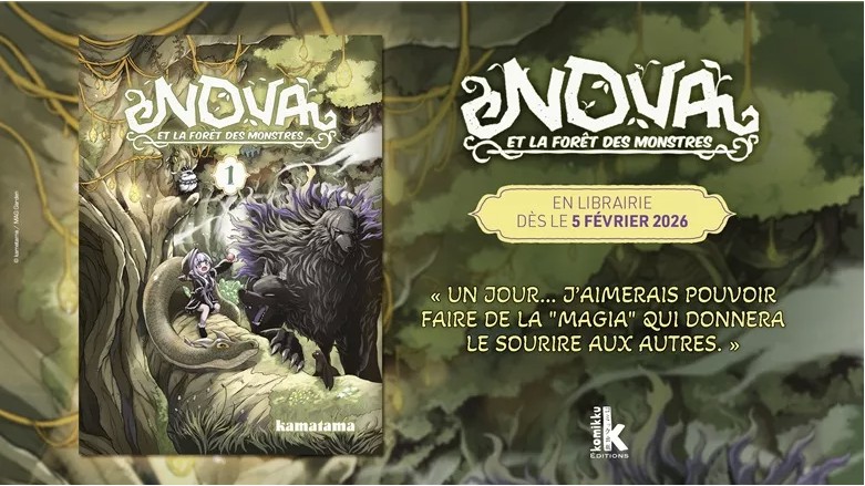 Les éditions Komikku ont décidé de commencer 2026 avec un petit plaisir forestier : la publication française de Nova et la forêt des monstres, un manga cosy fantasy prévu pour débarquer le 5 février 2026, affiché au prix modique (ou pas) de 7,99 €. Oui, encore un titre qui vous fera culpabiliser d’agrandir votre pile de lectures en retard.